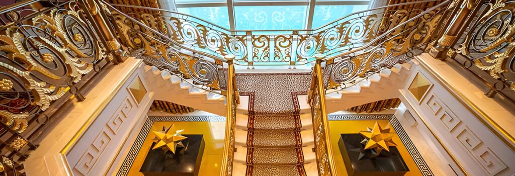Following a panoramic glass elevator ride to the 25th floor, be ready to be blown away as the doors of the imposing Royal Suite are opened for you. It is a true residential masterpiece where each of its rooms, bathrooms, amenities etc is designed down to immaculate detail with the priciest and finest materials. Feel the pinnacle of opulence as you see ‘his’ and ‘hers’ suites, sit on the master bedroom’s rotating bed, and step into the bath area with rich marble tubs and 24-carat gold tiles.