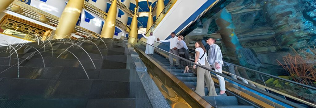 Upon your arrival at the hotel, you will be greeted in a traditional way by your Emirati host with rose water and hand towels. You will get to know about the never-before-heard interesting stories of this structure, including the insightful vision of Dubai’s ruler, which led to the making of this internationally renowned hotel two decades ago. You will be next escorted to the colorful lobby and then the tallest-of-its-kind cavernous atrium, featuring stunning water elements enriched by a burst of pleasing colors.